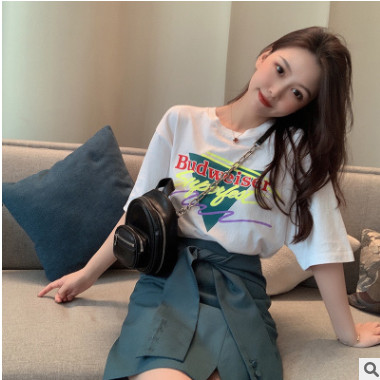 網紅同款系列 2019夏季新款寬松印花T恤綁帶高腰半身裙套裝女爆款