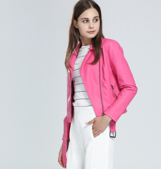 2018皮衣女新款玫紅色腰帶PU女士皮衣純色外套海寧皮衣歐美機(jī)車服