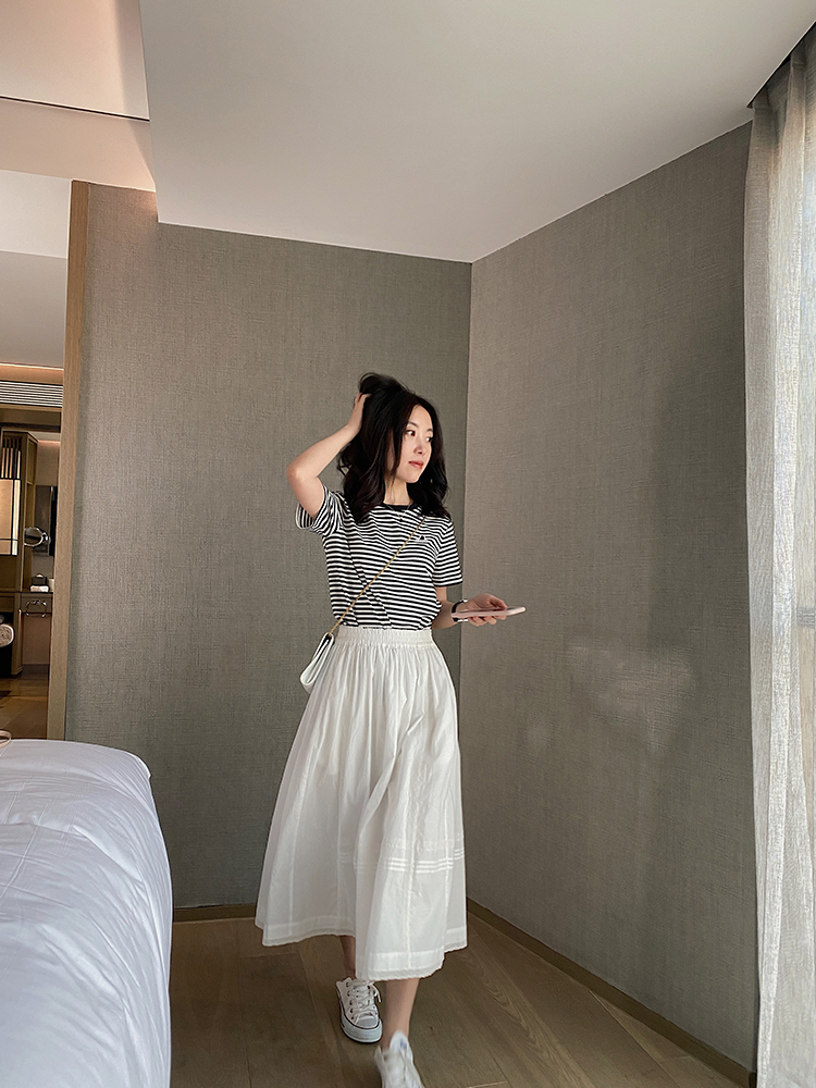 雙層的裙紙。不會(huì)透,放心。 搭配條紋T恤,是很日常的穿搭。 看上去氣質(zhì)很干凈那種。 也可以和本期白上衣成套穿搭, 穿出來(lái)的感覺(jué)會(huì)更仙一些。 這個(gè)牌子的東西一向難得, 就一單,喜歡的不要猶豫。