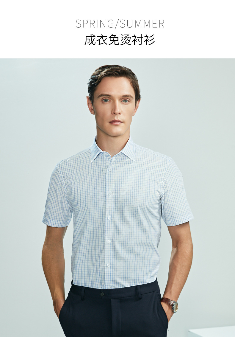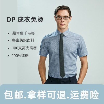 男士藏青色千鳥格純棉成衣免燙襯衣商務休閑短袖透氣舒適夏季襯衫