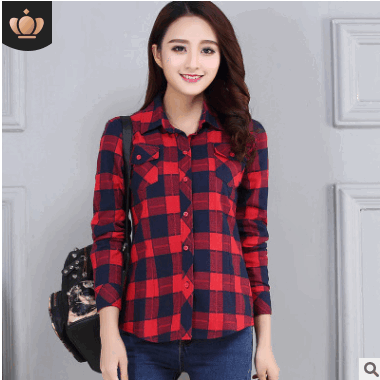 2017春夏新款韓版純棉磨毛格子襯衫女長袖大碼寬松打底外套學院風