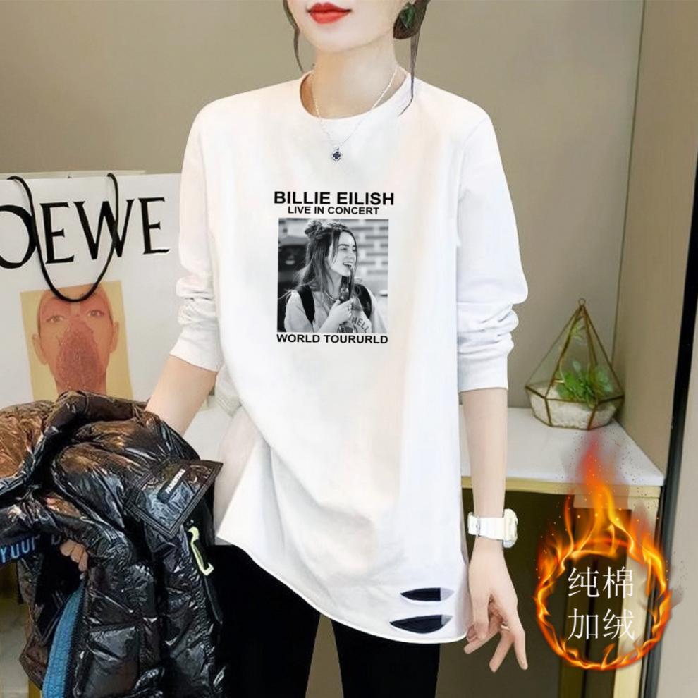 純棉加絨】中長款白色長袖T恤女打底衫圓領精梳棉上衣正肩破洞