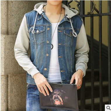 2018衛衣袖牛仔外套韓版假兩件連帽牛仔夾克一件代發 廠家直銷