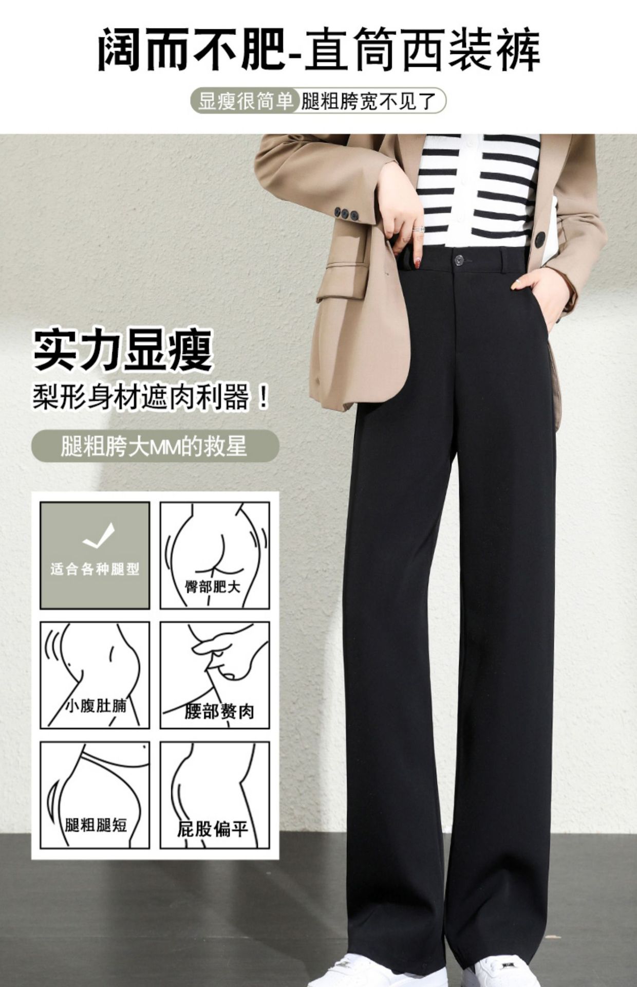 黑色西裝褲女夏季寬松顯瘦高腰垂感窄版松緊腰直筒闊腿褲加長
