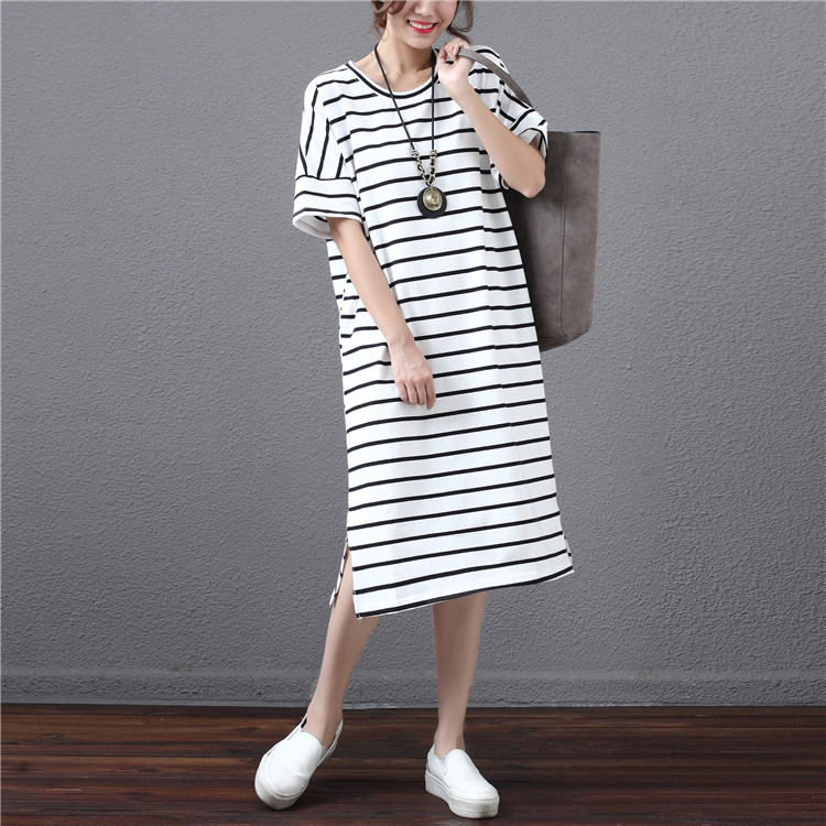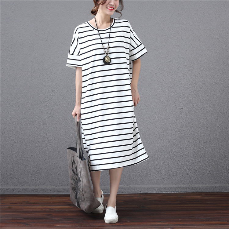 2018韓版外貿大碼女裝夏季新款胖mm寬松顯瘦條紋T恤中長款連衣裙