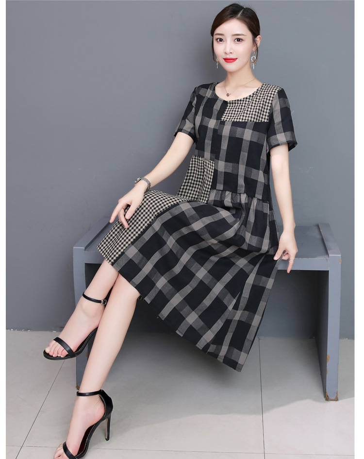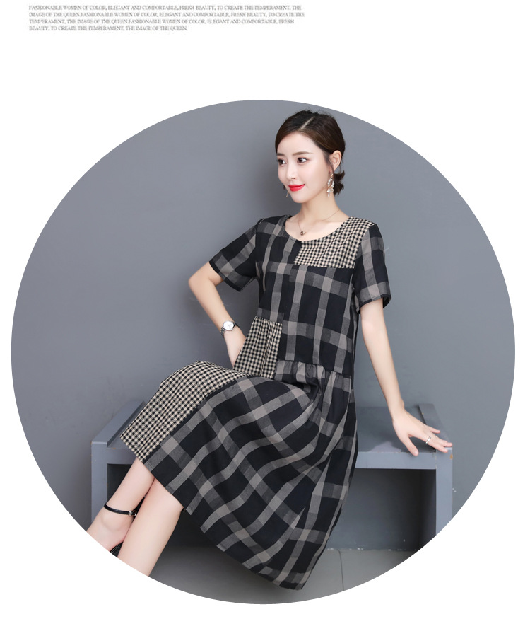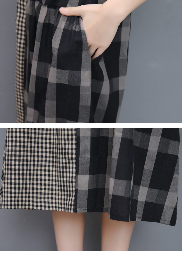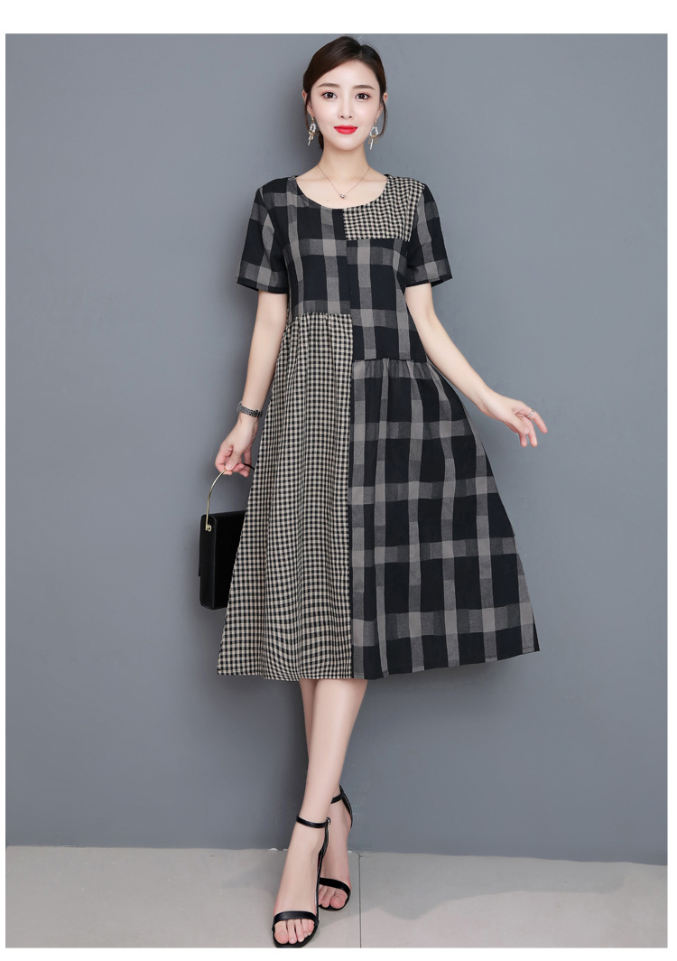 文藝拼接格子棉麻寬松圓領短袖連衣裙女中長款裙2019夏季新款實拍