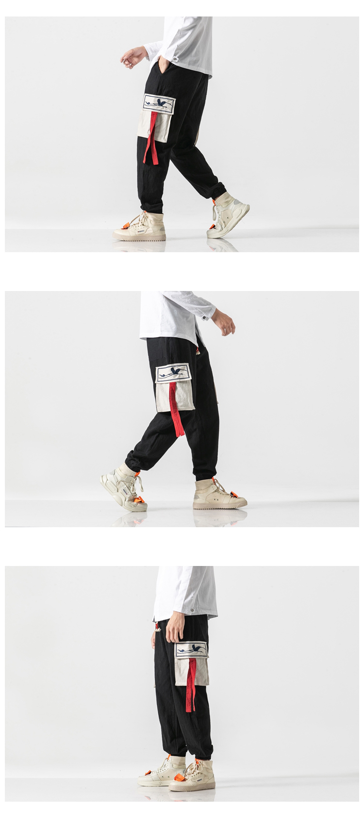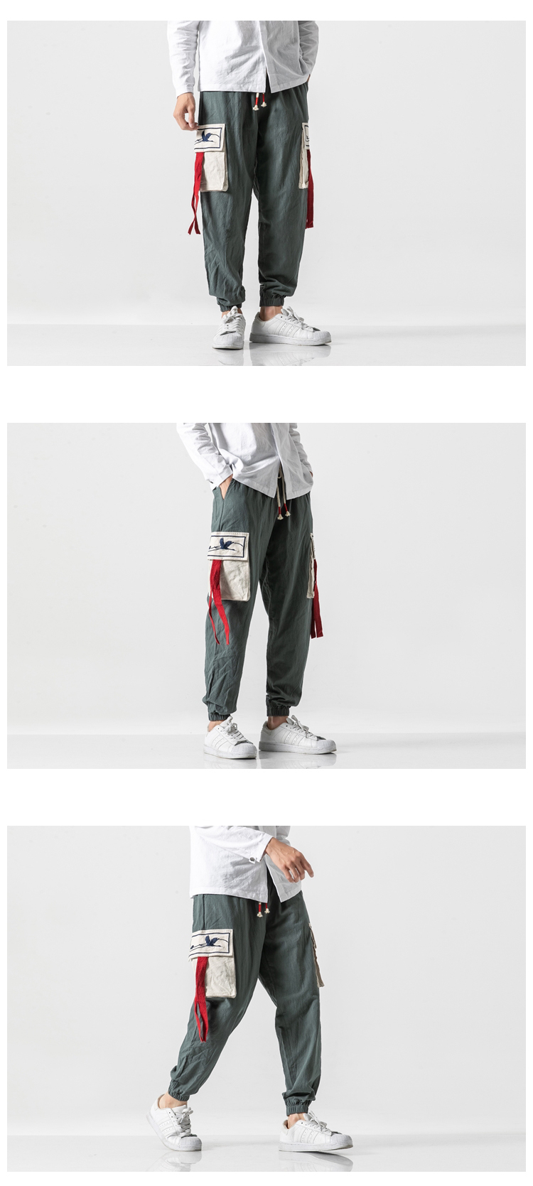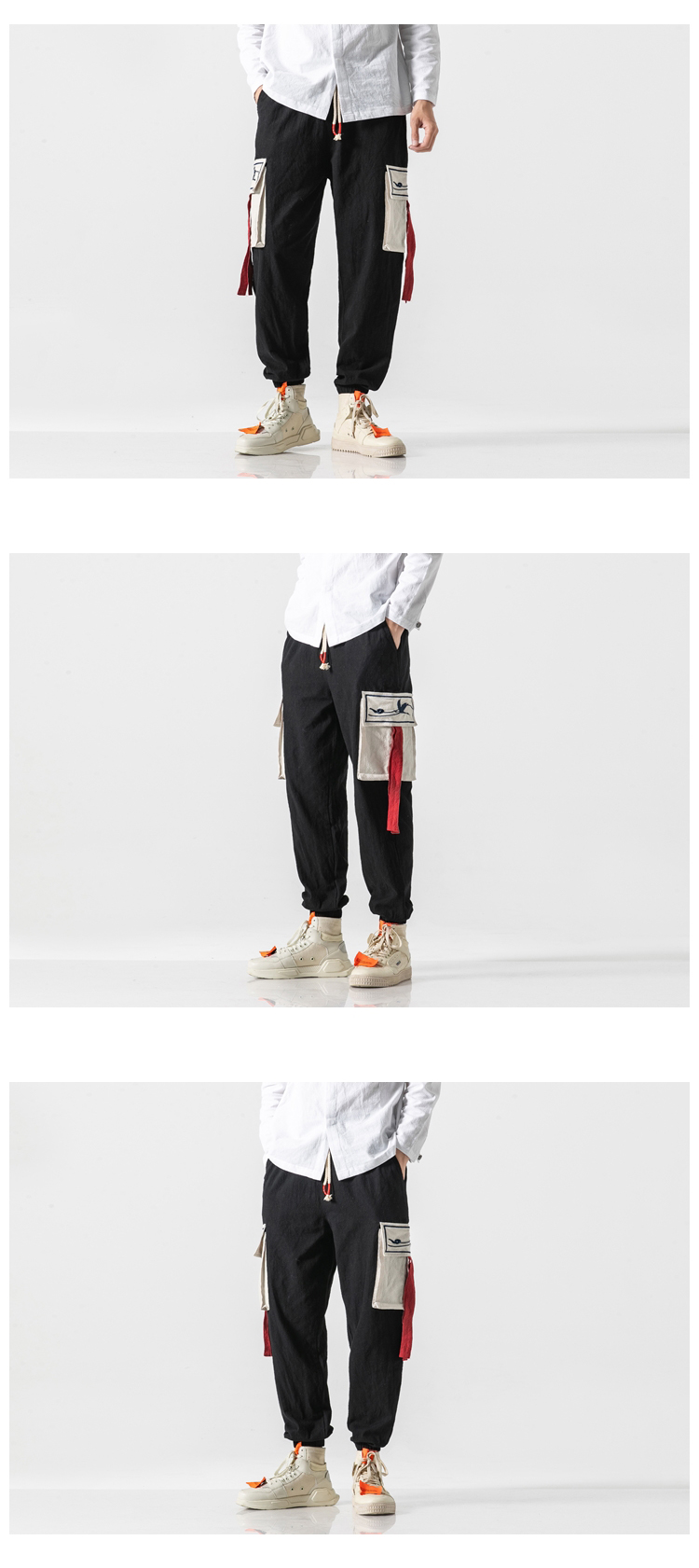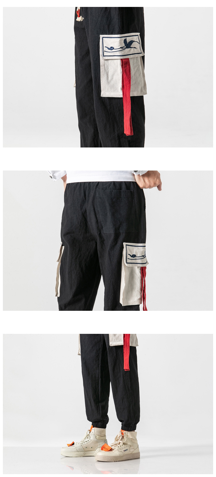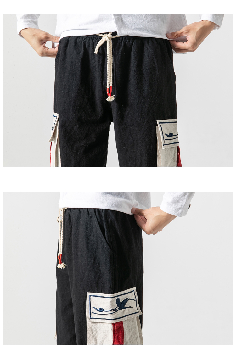 2019秋冬棉麻工裝褲飄帶刺繡國潮時尚日系百搭長褲寬松大口袋小腳