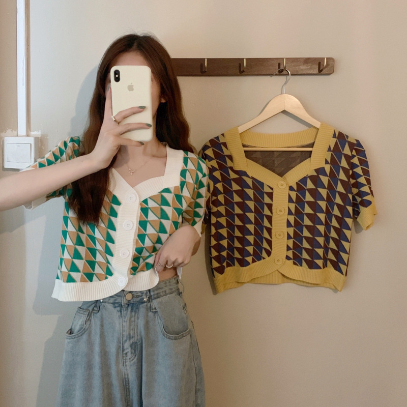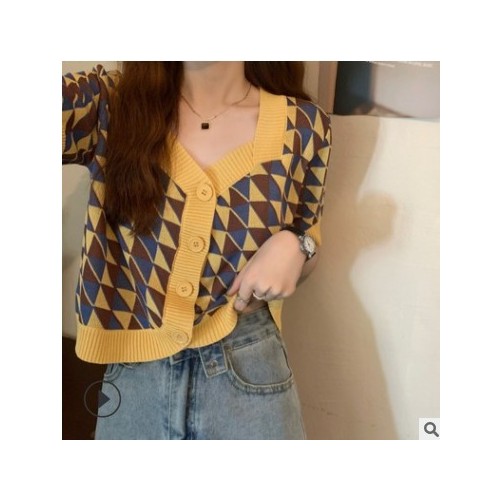 工廠直供2021新款夏季時尚韓版休閑復古菱格針織短袖開衫上衣女