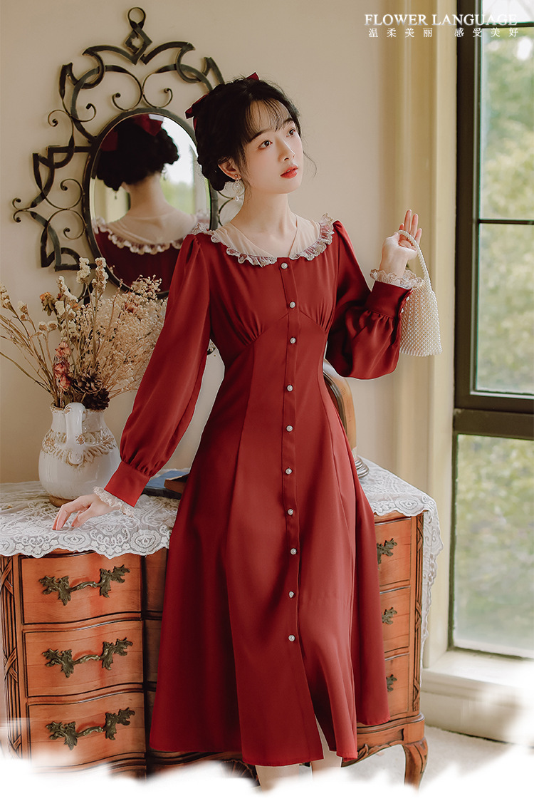 實拍女裝2021早春新款法式復古長袖純色連衣裙修身氣質長裙9677#