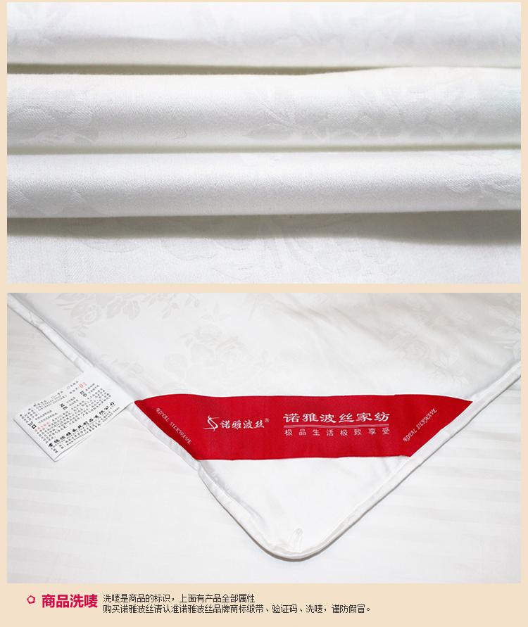 諾雅波絲被,精選****桑蠶上繭為原料,采用曾榮獲日本國科技部重大發(fā)明獎、貞明皇后紀念蠶絲獎的日本馬佩佩株式會社**技術,通過精密繅絲工藝形成單根波狀長絲絨,每根絲絨直徑約2.65但尼爾,單絲長800—1200米。在精密繅絲生產過程中設有單絲均布裝置、單絲回彈波狀安定處理裝置,當若干單絲上束之后,經過以上工藝形成波絲束自然均布有序的按照設定的門幅寬度片狀徑向進入特殊絎縫流程,然后將波絲有序緯向絎縫定位成設定規(guī)格的波絲絨片狀體,即“諾雅波絲”。諾雅波絲顏色雪白、質地均勻、輕柔(絲束緒頭可直扎眼球無痛感)、回彈性能好,不含油、無氣味,加工時不添加任何化學物質,無污染**環(huán)保,是一種品質極好、舒適宜人**的保暖材料。波狀的被胎結構有助于被褥中棉本體充分地吸收和保持空氣,形成保暖層,并借助絲胎結構良好的彈性、良好的水氣透析性、良好的排濕性以及波狀絹絲特殊的柔滑性,使諾雅波絲被輕柔至暖、冬暖夏涼的健康特性。諾雅波絲是經過安定處理工藝形成的**波狀長絲,具有**波狀安定性。