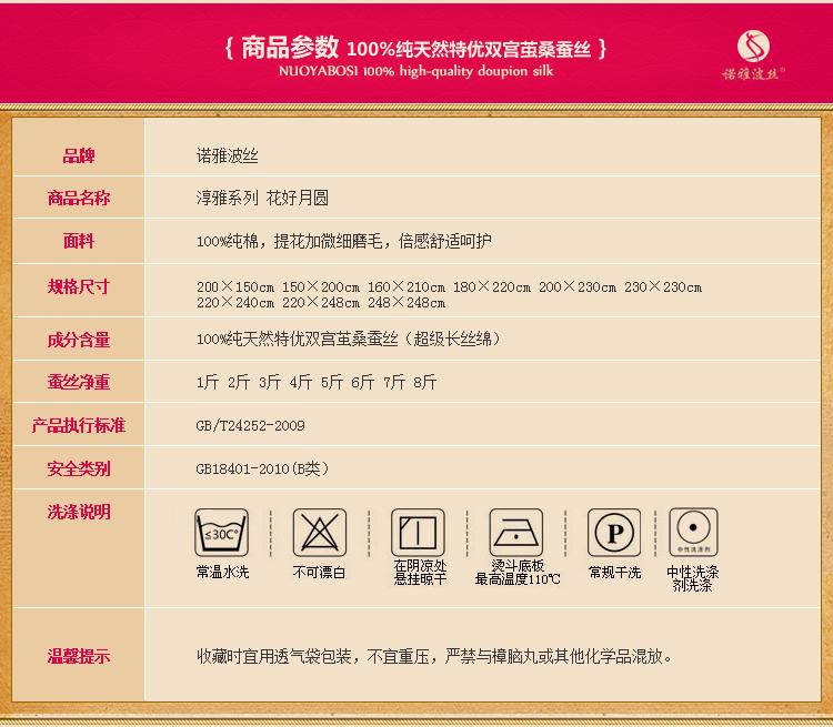 | 常德諾雅蠶絲制品有限公司蠶絲被均取材**桑蠶絲長絲綿,采用“內絎縫,內包邊,內街邊”**技術精心制作。公司擁有兩項全球**的制被科技發(fā)明** “水洗保潔、絲膠保健”技術,使絲膠含量更高,保健功能更強**的蠶絲被制作廠家,貼心的蠶絲被售后服務,諾雅蠶絲被產品承諾:本產品優(yōu)于傳統(tǒng)工藝,可水洗去污,50年免翻新。中國蠶絲被**聯(lián)盟認證品牌。 |