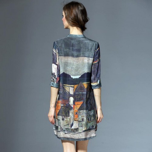 dantinglisi/丹婷麗絲 桑蠶絲大碼手工釘珠印花真絲連衣裙