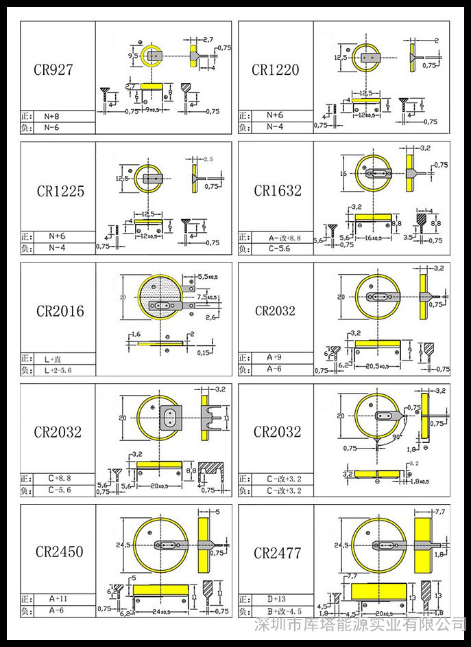 以下圖紙屬常規圖樣,若您需要的產品不在圖中,請向我司可按圖生產,也可根據客戶的需求,訂制特殊的焊腳樣式,以下為CR系列部分電池焊腳結構圖紙: