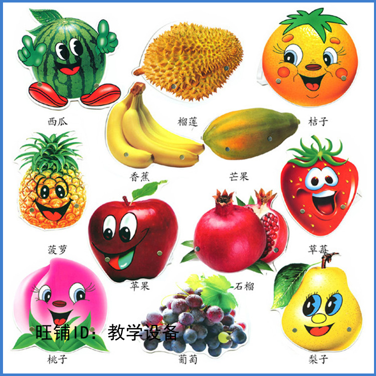 西瓜、香蕉、蘋果、葡萄、菠蘿、桃子、桔子、梨、芒果、榴蓮、石榴、草莓、菠菜、絲瓜、青菜、白菜、包菜、黃瓜、冬瓜、南瓜、番茄、茄子、牡丹花、荷花、葵花、喇叭花、桃花、玫瑰花、紫色花、小花、小草、大樹