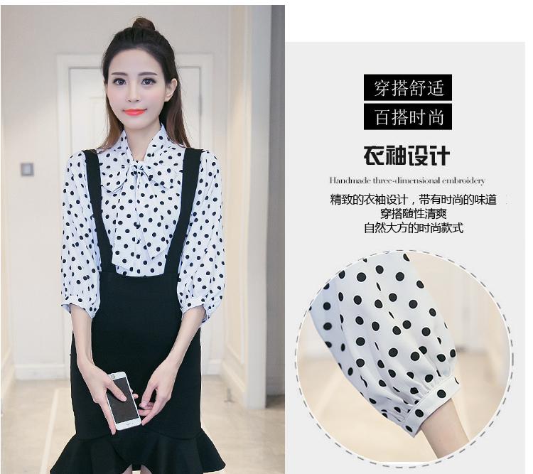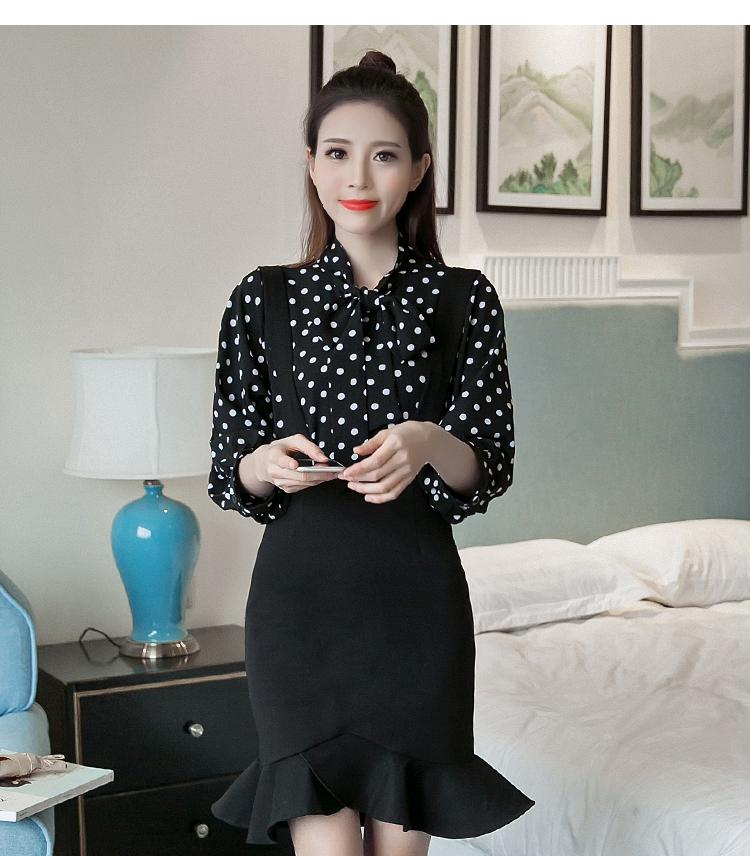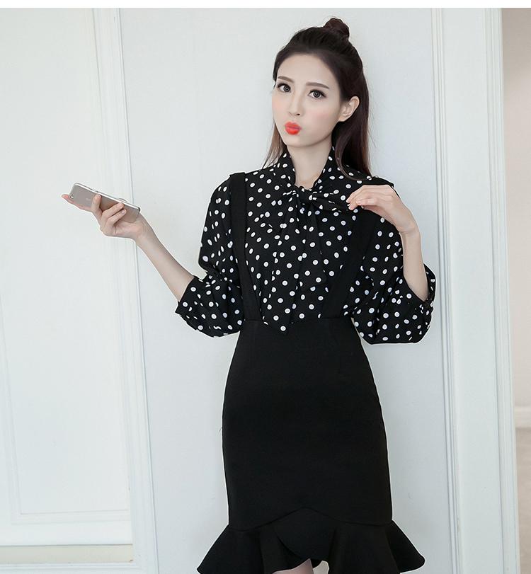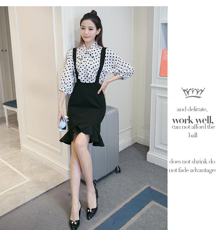 實拍新款 黑白波點雪紡上衣+韓版修身背帶魚尾裙套裝