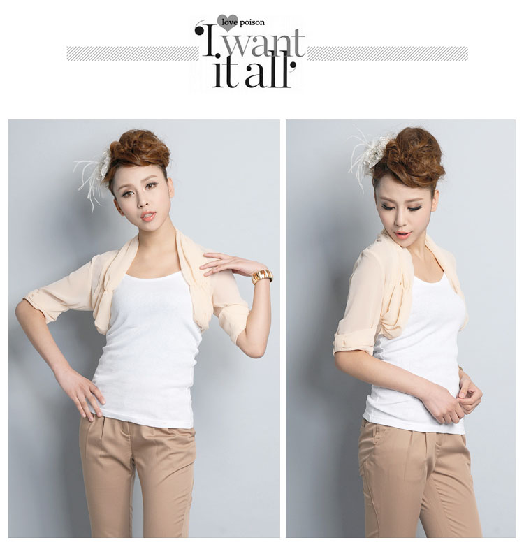 設計要點:從微涼的春季到炎熱的夏季再到時冷時熱的秋季,MM們都會需要一件既能遮陽又能保暖的小外套。這款小外套不同于市面上千篇一律的簡單設計,而是在領口用雪紡縫制處立體花型,雪紡輕薄的質地絲毫不會因此帶來負擔。袖口也略微做的如同西裝袖口的褶皺,更是平添一份知性。如此簡單又有設計感的小外套,MM們還不趕快出手! **強賣點:雪紡/立體領口/百搭/知性/ |
