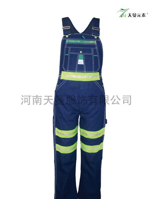 全棉靛藍牛仔布;背帶可調節;一個拉鏈胸兜,多個工具兜,后背臀部貼兜,兩個斜插褲兜;腰部可調節松緊;腰部和褲腿帶有反光條。