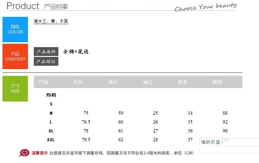| 袖長:長袖 | 誤差范圍:2-3公分 |