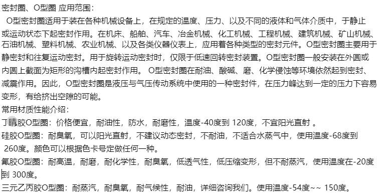 | 用途 | 汽車、機械設備、管路閥門等使用的耐磨、密封、防水、防油、防塵等的密封圈 |