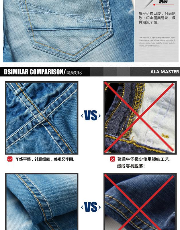 | 水洗展示:特色壓皺效果,紋理線條分明;磨白做舊工藝,造**牛仔褲更時尚獨特的外觀 | 后袋設(shè)計:盾形拼接口袋,時尚別致;閃電圖案繡花**潮流個性 | 面料:全棉 |