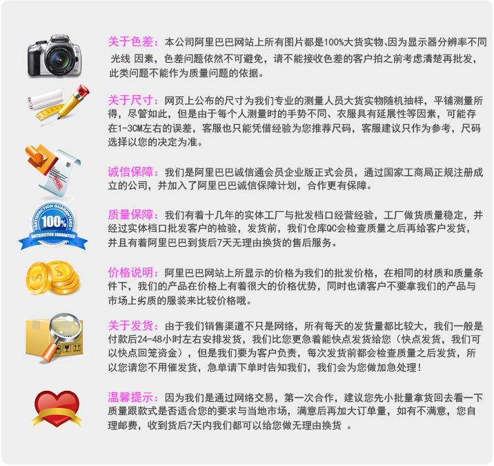 | 洗滌說明 | 建議反面輕揉洗滌,不宜用熱水清洗,懸掛晾干,深色衣服請與淺色衣服分開洗滌,避免染色。 |