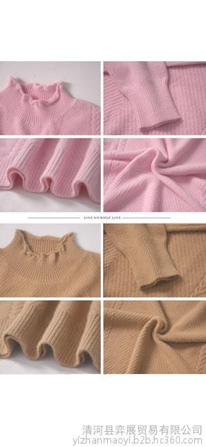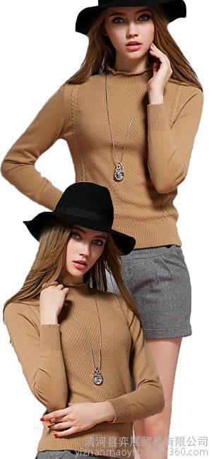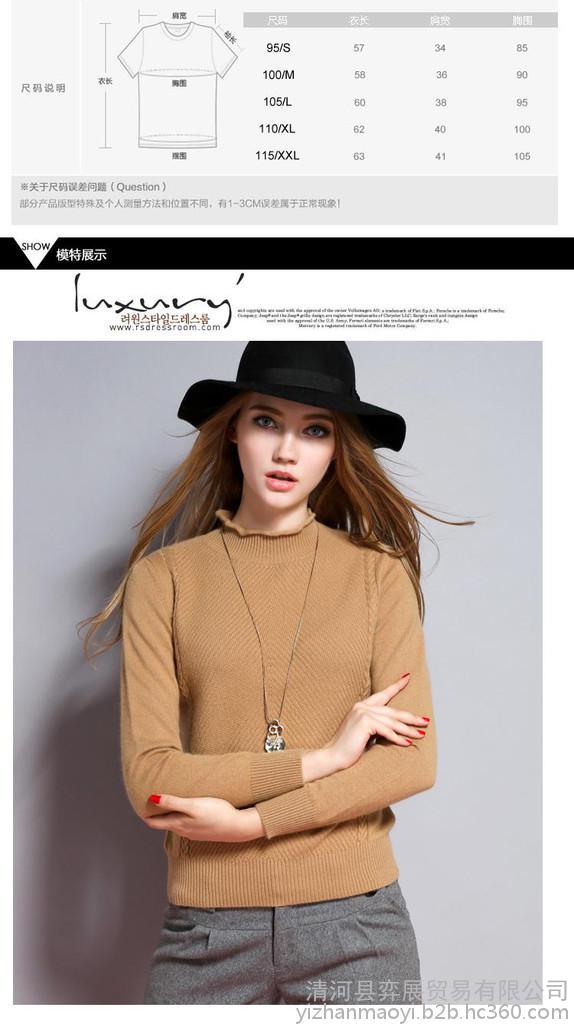 品牌:solely 茜歐莉品名:提花針織打底羊絨衫女面料:羊絨針型紗支:12針26支顏色:灰色 軍綠色 黑色 粉色 銹紅色 駝色尺碼:S/95 M/100 L/105 XL/110 XXL/115 設計風格:半高木耳領 側擺扭花 不規則紋理針織單品設計風格羊毛面料,精密高紡而成,毛質細密,天然柔滑貼合肌膚,特殊處理不易起球,相比其他材質面料,制作有型挺括,柔軟舒適。色澤飽滿,色牢度高不易變色,高水準印染,面料蘊含恰到好處的柔軟質感,精細親膚,營造出靈活修身的廓形。純色凈面提花針織錯落編織紋理及花邊領,時尚女性所擁有的無法抵抗的優雅單品,以細密規整的車工打造人體工程學外觀,純粹**的線型剪裁,嚴密結構和邏輯思維的**結合木耳花邊半高領圓領保暖設計,車工均勻,走線嚴謹;純色針織,平淡簡約,休閑保暖款,提花紋理的編織,顯現女性的柔美氣質;螺紋下擺與袖口工藝相呼應,彈性好不易變形,更貼合身體曲線。純色凈面提花錯落編織針織,干凈素雅,清純素雅,干練,束腰瘦身簡約百搭保暖打底居家,校園,午后咖啡屋,外出旅行,任何場合都讓您暖暖的,備受關注;給愛人情人,家人,朋友,都是暖暖的愛的表達。