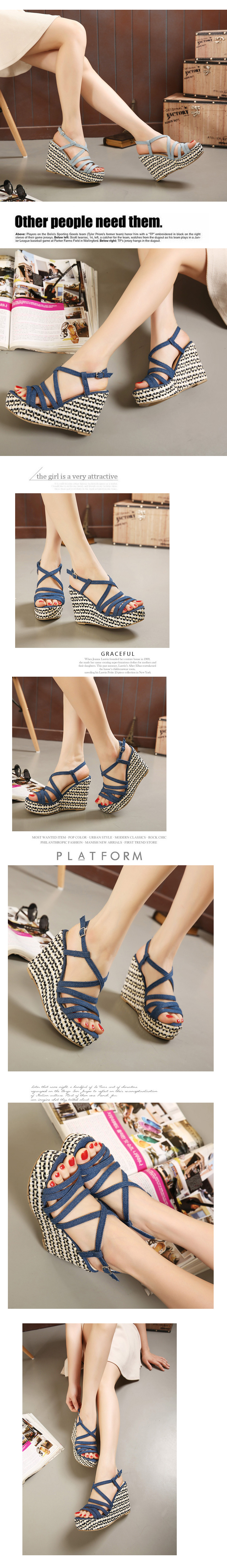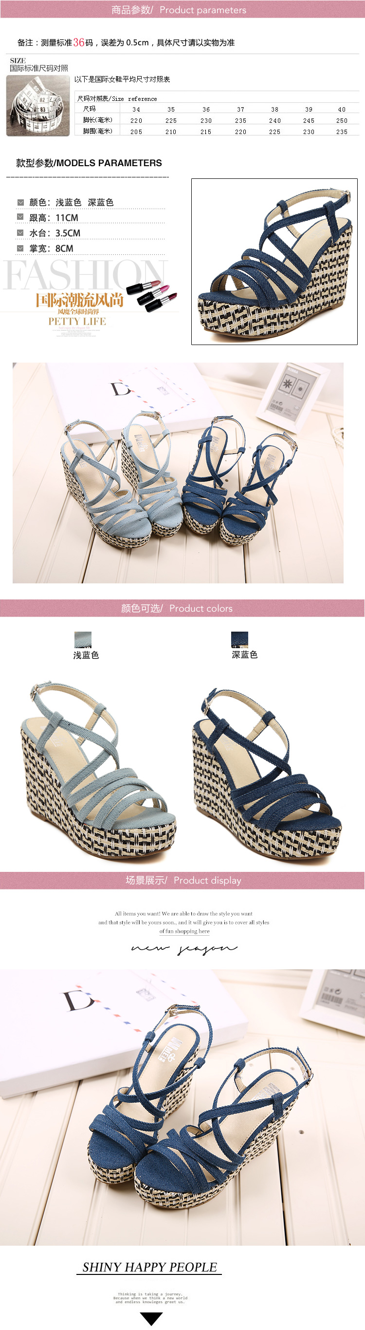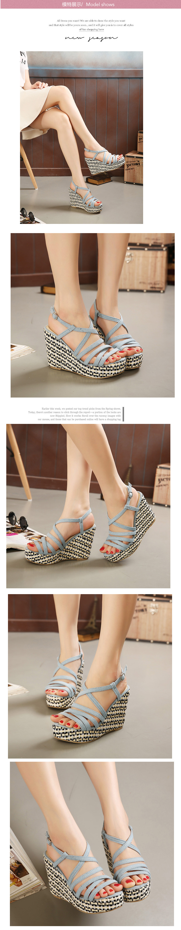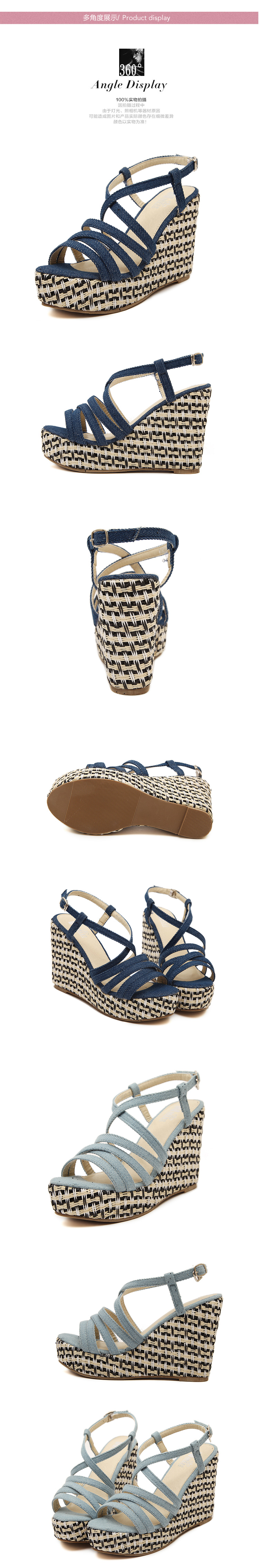 2015夏季韓版VIVI雜志新款波西米亞超高跟細帶牛仔布坡跟