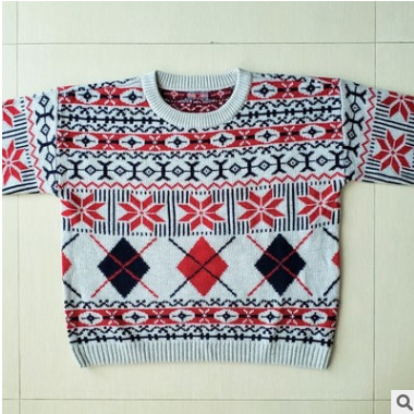 [北歐傳統織花]長袖低肩圓領童厚毛衣秋冬季條紋幾何圖形間色