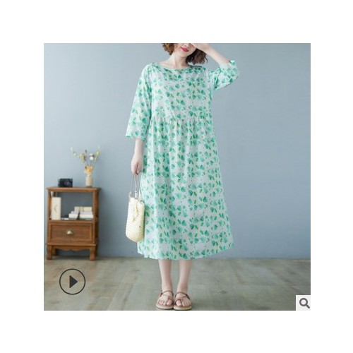 夏季新品大碼胖MM女裝雪紡印花綠色樹葉系帶飄逸短袖顯瘦連衣裙女