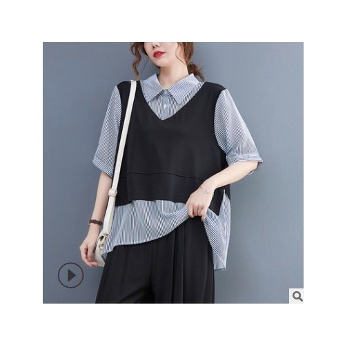 2021年夏季新款大碼胖妹妹女裝時尚假兩件撞色短袖顯瘦上衣襯衫女