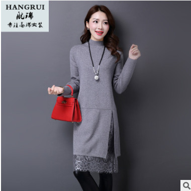 廠家直銷新款貂絨毛衣裙女中長款高領(lǐng)下擺開叉蕾絲羊絨毛女打底衫